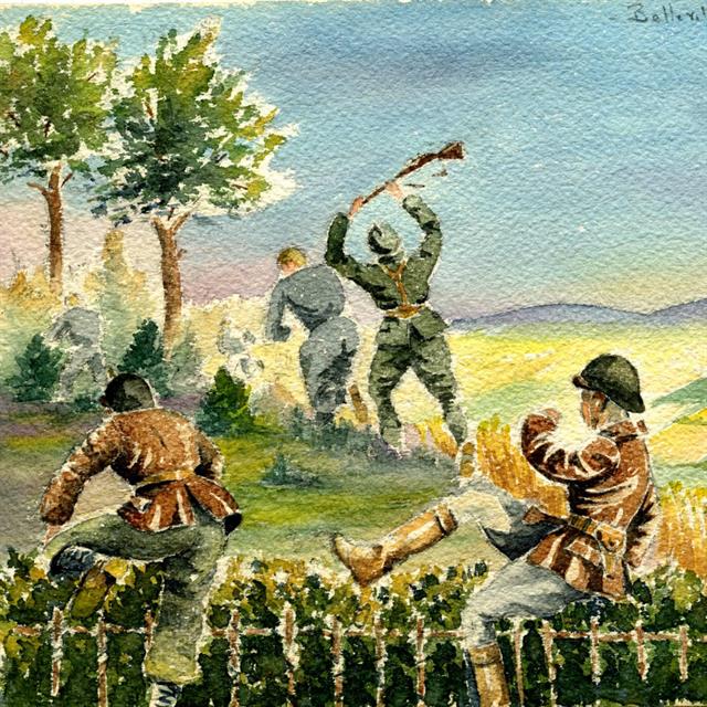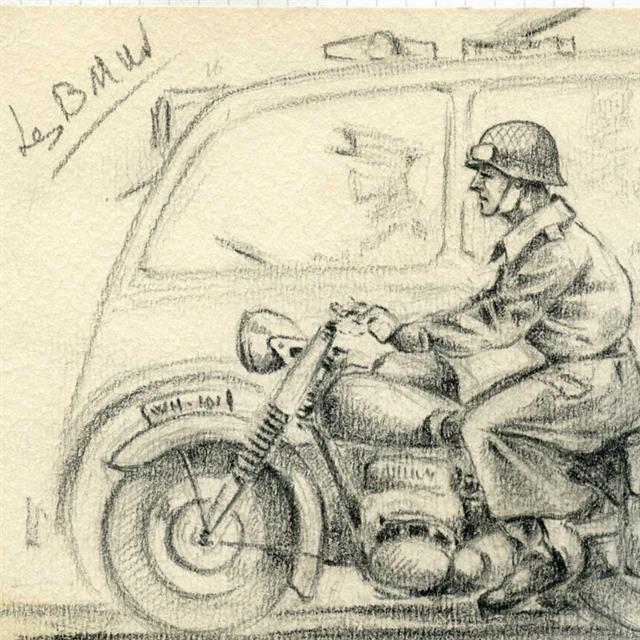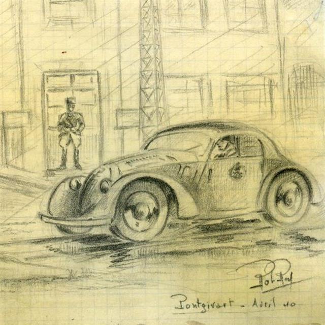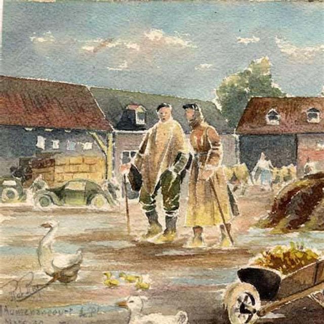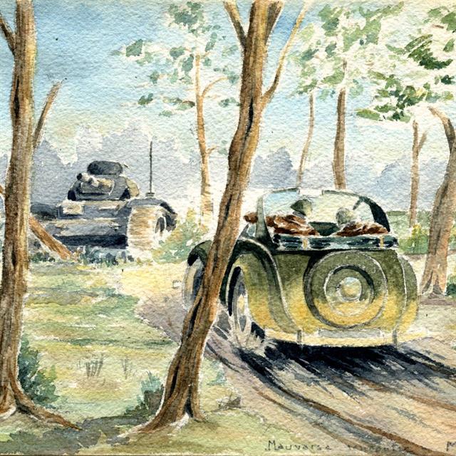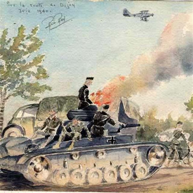 Robert de la Riviere (1909-1992) dit Rob Roy peintre aquarelliste, très connu dans le domaine de l’automobile, a retracé la grande épopée des courses entre les deux guerres ; Ces derniers mois, un travail mémoriel de ses enfants et petits enfants a permis de sortir des ‘‘cartons’’ ses carnets de guerre composés de textes, aquarelles et dessins. Rob Roy y raconte sa vie au quotidien depuis sa mobilisation en 1939, les combats en mai et juin 1940 dans les régions de Reims, Vouziers, et Vitry le François, sa capture par les Allemands à St Didier prés de Saulieu la captivité en Autriche dans le stalag XVIIB, la période de l’occupation à Chatou dans la région parisienne, où sa famille réside, jusqu’à la libération de Paris en août 1944.